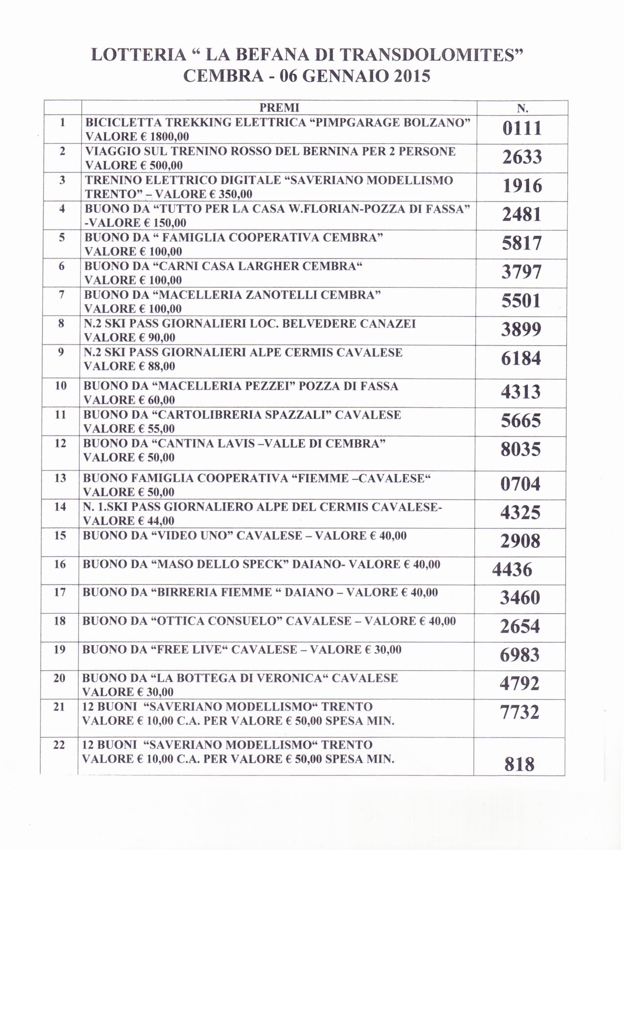 comunicazione dei biglietti vincenti la lotteria “ La Befana di Transdolomites” la cui estrazione si è avuta il 6 gennaio u.s. a Cembra.